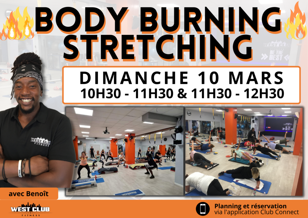 Body Burning et Stretching avec Benoit, dimanche 10 mars à partir de 10H30 lundi 26 février 2024 Un Body Burning suivi d’un Stretching avec Benoit, dimanche 10 mars de 10h30 à 12h30 inscription via l’appli Club Connect