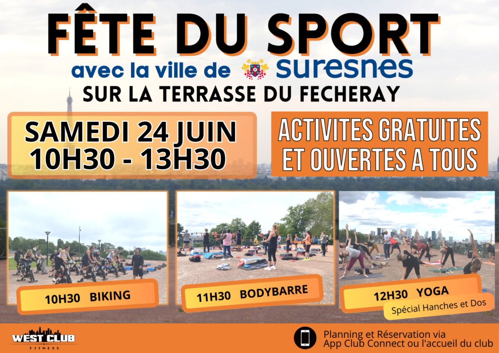 La ville de Suresnes organise la Fête du Sport 2023, le samedi 24 juin, West Club Fitness est partenaire de cet événement, et sera présent sur la Terrasse du Fecheray des 10h30 pour plusieurs activités sportives.